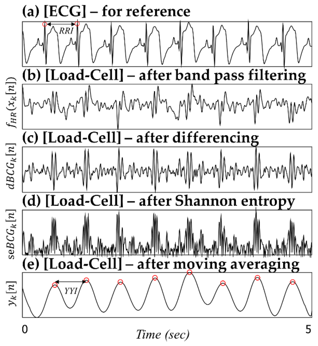 In Figure 5, for example, according to the seven successive RR intervals (intervals between the R-peaks from the ECG signal), the average RR interval (RRI) from the ECG signal is 0.5874 ± 0.0169 s. In contrast, the average YY interval (YYI) from the signal is 0.5851 ± 0.0226 s. Additionally, the average difference between RRI and YYI (|RRI-YYI|) is 0.0103 ± 0.0069 s. Heartbeat information can be extracted quite well by applying the above data processing stage. This preconditioning is useful for handling BCG signals with less-dominant peak components caused by small heartbeat amplitudes.
