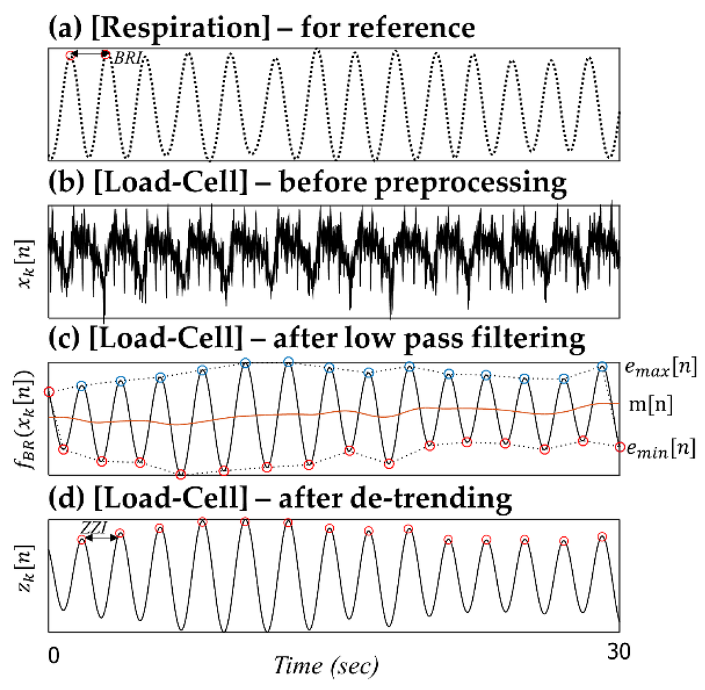 Hereafter, the de-trended signal is denoted as . As in the HR analysis, the peak finding and calculation stage are conducted according to the signal corresponding to the optimum signals selected by the signal quality check and sensor selection stages. In Figure 6, for example, according to the 13 successive breathing intervals (BRI), the average breathing interval from the respiratory signal is 2.0945 ± 0.1354 s. In contrast, the average ZZI from the signal is 2.1015 ± 0.0945 s. The average difference between BRI and ZZI (|BRI-ZZI|) is 0.0545 ± 0.0349 s.