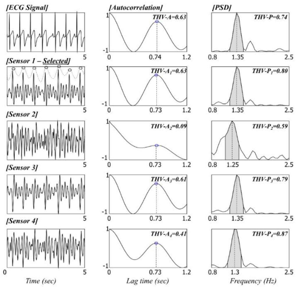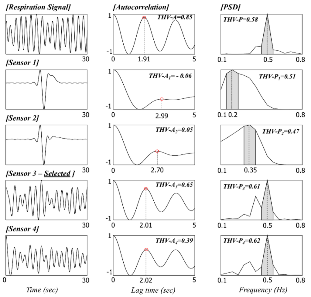 In addition, we developed signal quality indicators (THV-Sk) by using the calculated threshold parameters based on the autocorrelation (THV-Ak) and power spectral densities (THV-Pk). The indicators were used for estimating the level of artifacts in the following signal quality check and sensor selection processes. The following details of signal quality calculations for optimal sensor selection are illustrated in Figure 7 (HR) and Figure 8 (BR).