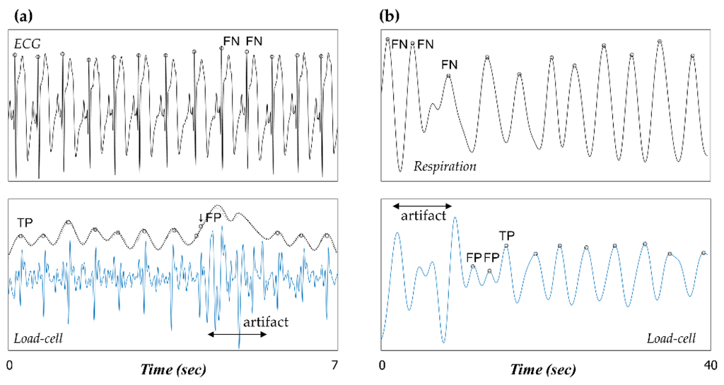 As in the case of many unobtrusive monitoring, the signals acquired by our load-cell system are prone to high-grade noise. The main artifacts are related to movement, which is an inevitable consequence of physiological monitoring. Thus, the most important aspect of signal analysis using unobtrusive sensors is to classify the good-quality signals. In our results, FN is defined as the failure to detect an existing ECG or respiratory peak. It is assumed that most FNs were the result of our algorithm automatically determining an analysis window to be a noise signal and discarding all peaks included in the window. We additionally investigate how FN results inevitably occur in the artifact area and are denoted as FN (inevitable).