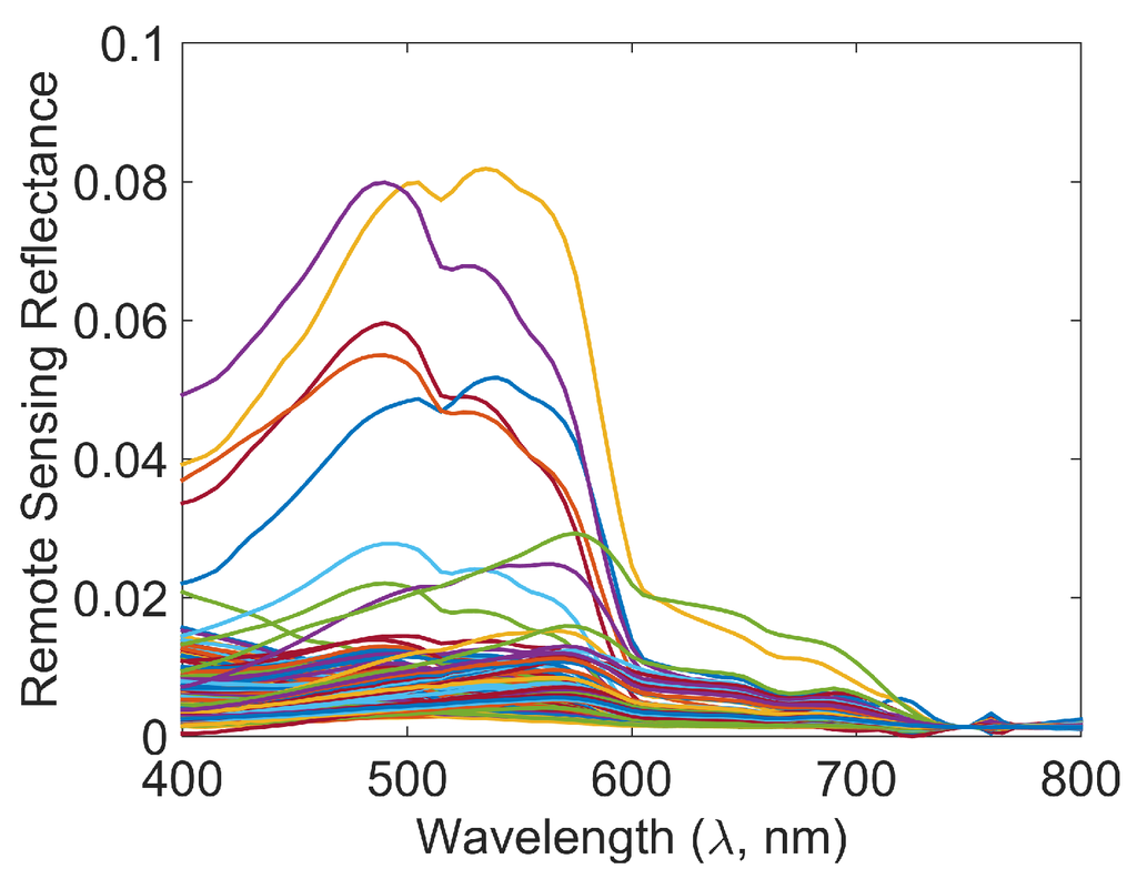 Dataset 1: The authors of [11] have collected the in situ remote sensing reflectance spectra of samples collected from all over the world, from the East China Sea in the east to Hawaii in the west, as reported in Table 1 of [11]. The data is spectrally diverse and from sources spanning shallow waters, deep oceans, prolific algal masses, and harmful red algae bloom with distinct red tinge. Further details about the data can be found in [11]. The remote sensing reflectances of the 281 locations from [11] are reproduced in Figure 1. For the ease of reference, we call this dataset Dataset 1.