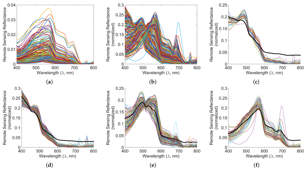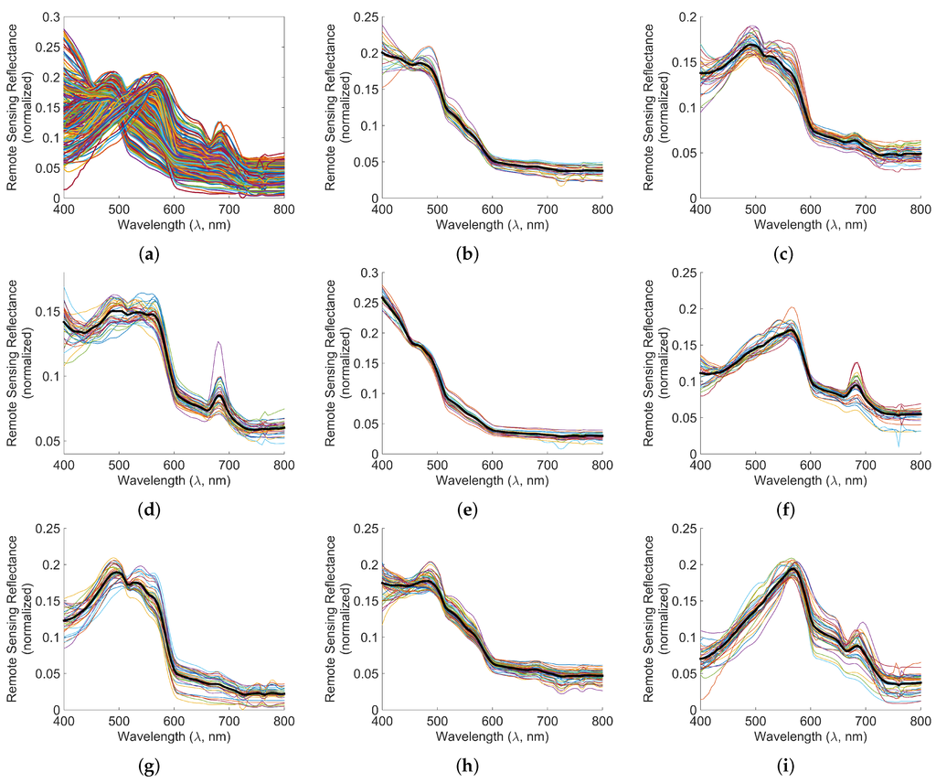 The normalized remote sensing reflectance spectra of the samples in the Dataset 1 are shown in Figure 8a. The clustering results, i.e., classes are shown in Figure 8b–i. The thick black line shows the centroid and the thin lines show the members of the class in each sub-figure.