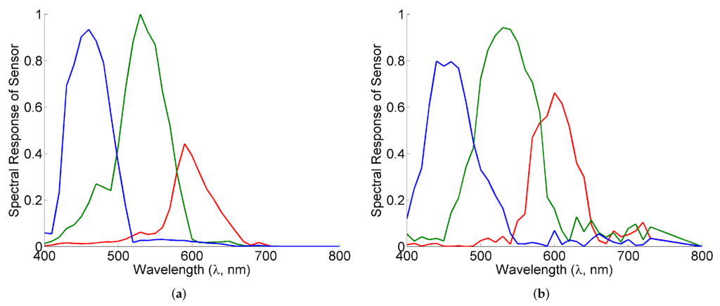 Spectral responses of the various channels of sensors of the consumer camera considered in this paper. (a) Canon 1D Mark III; (b) Nikon D40.