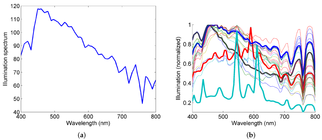 Illumination spectrum of D65 illumination (a) and 25 illuminations measured in outdoor scenarios at various locations and times in Barnard dataset (b). The thick lines show the general trends of these illuminations in (b).
