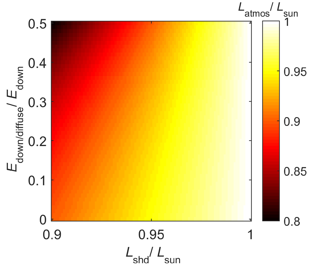 An underlying assumption in our formulation for both satellite and airborne sensors is that the downwelling irradiance and general atmospheric conditions such as aerosol concentrations and earth surface reflections are locally uniform in the region containing the data point and the cloud or the white reference. Here, we discuss the criterion for calling the downwelling irradiance as locally uniform. Indeed, the downwelling irradiance is a function of the zenith angle, the local cloud cover, local weather conditions, the azimuthal angle, etc., which may be different over any two points, besides the constant factors such as the time of the day and the earth’s position on its orbit. Notably, the trigonometric and other terms which do not vary with the wavelength do not affect the proposed algorithm because of the normalization of the canonical data as explained in Equation (16).