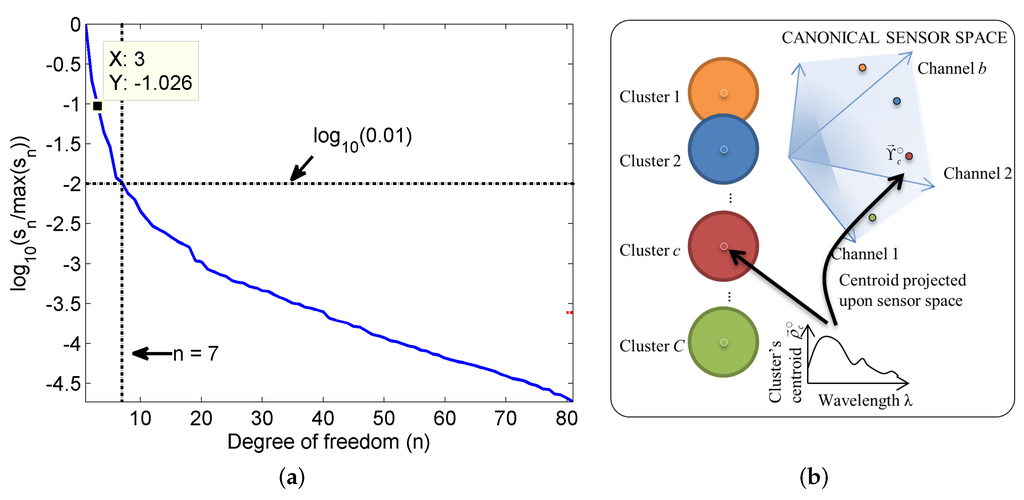 Estimating a suitable value for the number of clusters can be done by analyzing the singular values of the reflectance data (a); illustration of the formation of the lookup table in given in (b).