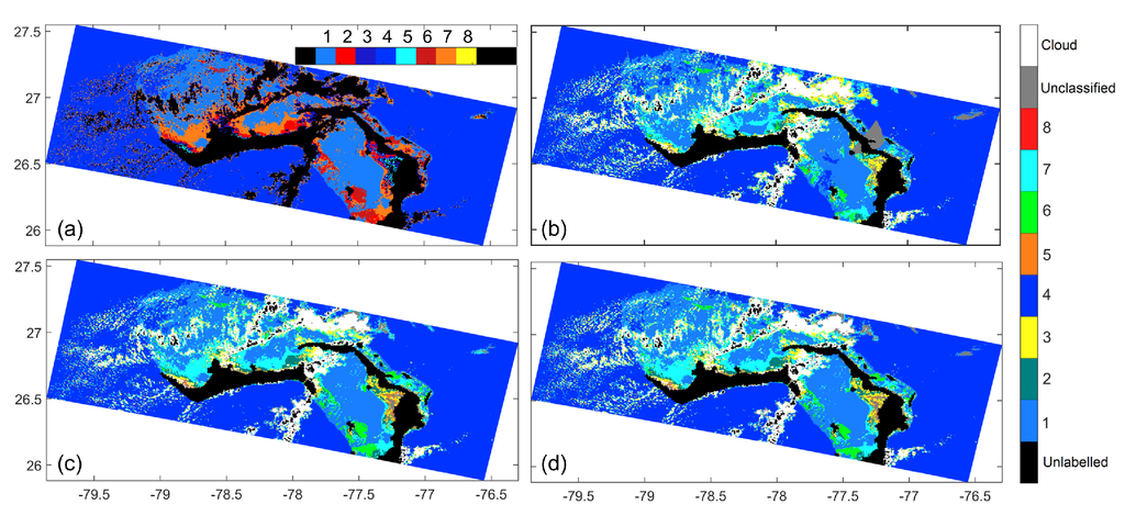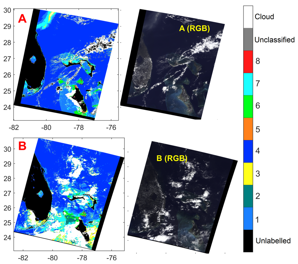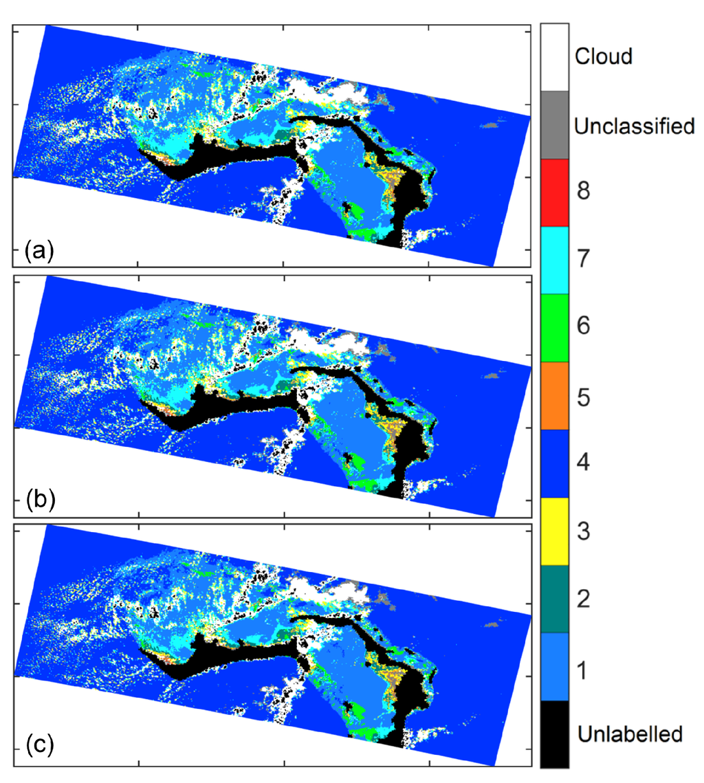 However, using the example of the Grand Bahamas shown in Figure 10b–d, we show that our approach is relatively robust against the choice of the cloud region. We consider three options for choosing the cloud region. The first option, , is to use only the radiometric data corresponding to the cloud closest to the data point. This result is shown in Figure 10b. The second option, , as used for generating the results in Figure 9, is the mean data corresponding to the all the cloud pixels within 110 km of the data point. The result is shown in Figure 10c. The last option, , is the mean data corresponding to all the pixels in the scene portion of Grand Bahamas shown in Figure 10a. The maximum distance between cloud pixel and data point in the scene is about 390 km. The classification result for this option are shown in Figure 10d. We tabulate the percentage of pixels classified differently between any two options in Table 7. When the unclassified pixels are included in computing, the percentage values are determined as pixels classified differently in the two options out of the total number of ocean pixels. When the unclassified pixels are excluded, the percentage values are determined as pixels assigned a valid class but classified differently in the two options out of the total number of ocean pixels that are assigned a valid class in both of the options. The results in Figure 10b–d show that the and options are more robust, resulting in fewer unclassified pixels. Table 7 further shows that using different options results only in small variations in the classification.
