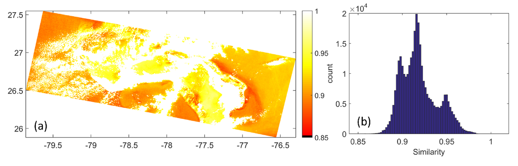 The cosine similarity map for the Grand Bahamas region is shown in Figure 11a, and the histogram of the similarity values is potted in Figure 11b. It is seen that the similarity is very high across all the data points, with maximum of data points demonstrating a similarity of 0.91. The mean similarity for the entire region in Figure 11a is 0.913. This shows good spectral agreement between the remote sensing reflectances estimated using the proposed method and MERIS level 2 processing.