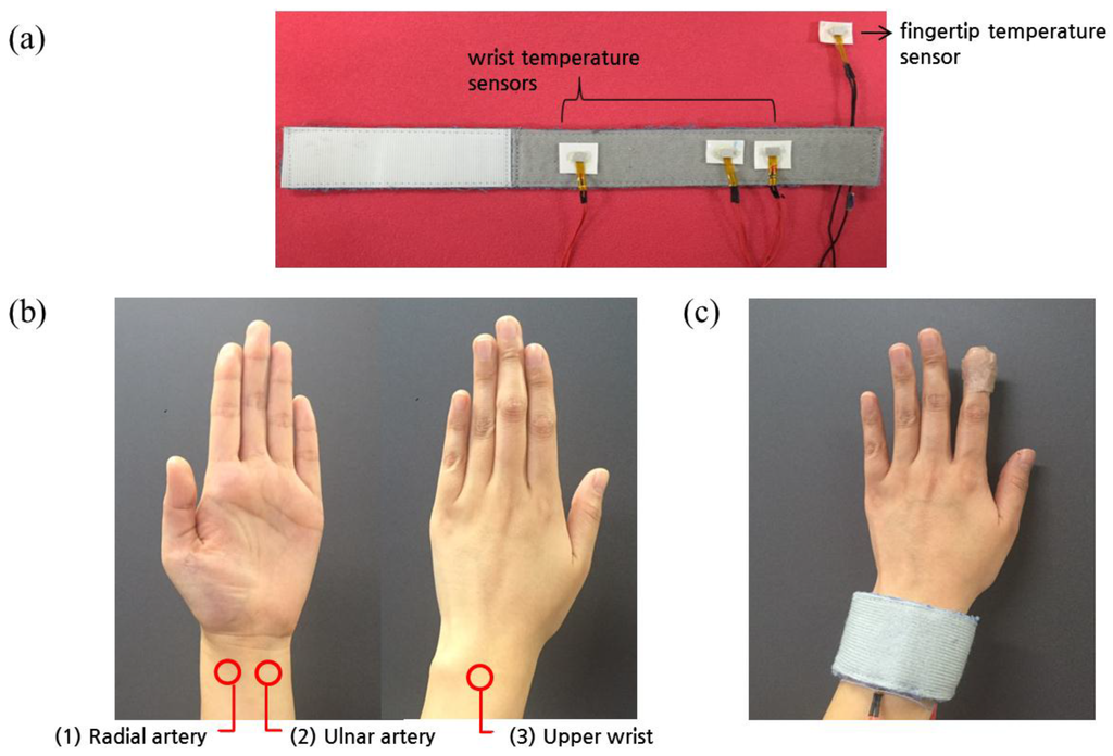 (a) A wrist band containing four temperature sensors; (b) The three wrist regions for skin temperature monitoring; (c) The wearable skin temperature monitoring device for the wrist and fingertip.