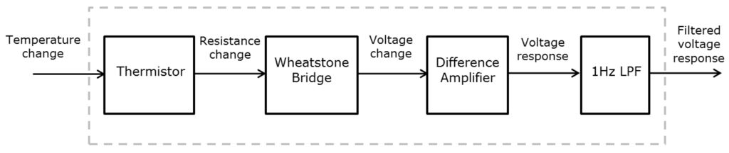 The temperature sensing module was designed with a protruding shape to ensure stable contact with the skin. A film-type NTC thermistor (LNJT103F, Lattron, Daejeon, Korea) was used, and each temperature sensor was covered with an thin aluminum cover. As each subject’s wrist size is different, we designed the temperature sensing module so that it could be moved and suitably positioned on each subject’s wrist region. The temperature measurement circuit was composed of a Wheatstone Bridge electrical circuit with a differential amplifier and a 1-Hz low-pass filter as shown in Figure 2.