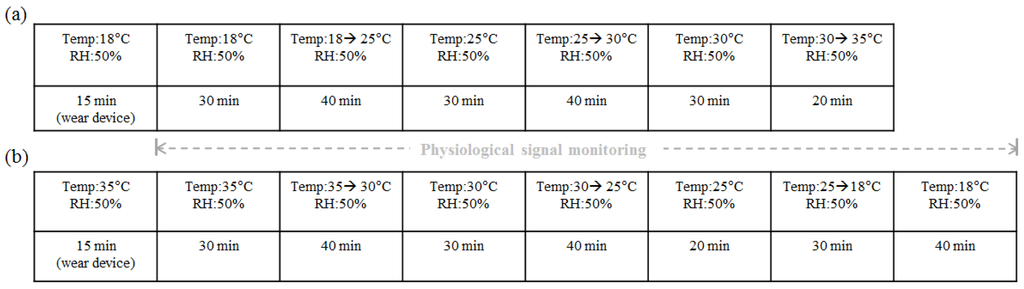 Eight healthy subjects (six men and two women, aged 26.63 ± 2.00 years, body mass index: 22.45 ± 2.63 kg/m2) participated in this study. Each subject wore trousers and a short-sleeve shirt (0.57 clo) [1]. To observe skin temperature changes with the thermal sensation variation, we adjusted the ambient temperature using a walk-in climate chamber (EBL-5HW2P3A-22, Tabai-Espec Corp., Osaka, Japan), according to the protocols shown in Figure 3. Skin temperatures were acquired from four subjects when the ambient temperature was increased from 18 °C to 35 °C. Then skin temperatures were obtained from the other four subjects when the ambient temperature was decreased from 35 °C to 18 °C. Relative humidity was maintained at 50% during the entire experimental sessions. The chamber was equipped with a ceiling that had hundreds of air holes, and the air was cooled or heated by a water circulation system. Air speed in the chamber was measured with an anemometer (Model A531, Kanomax Japan, Inc., Osaka, Japan) and maintained at < 0.2 m/s under a steady state condition. During the experiment, subjects sat on a chair in the center of the chamber and performed office work such as reading a document, using a smartphone, and writing. Subjects liberally moved their arms around or placed their arms on their leg while doing office work. To reduce the thermal effect of surrounding objects, direct contact with a table or wall was prohibited. The wrist band was worn on the subject’s non-dominant hand, and the fingertip temperature sensor was attached to the index finger. Skin temperatures from the fingertip, RA region, UA region, and UW were acquired every 1 s. The subjective perception of the overall thermal sensation was assessed using a 9-point scale: very hot (+4), hot (+3), warm (+2), slightly warm (+1), neutral (0), slightly cool (−1), cool (−2), cold (−3), and very cold (−4). Each subject was instructed to mark their subjective thermal sensation on a paper every 2 min to follow the variation in thermal sensation during experiment.