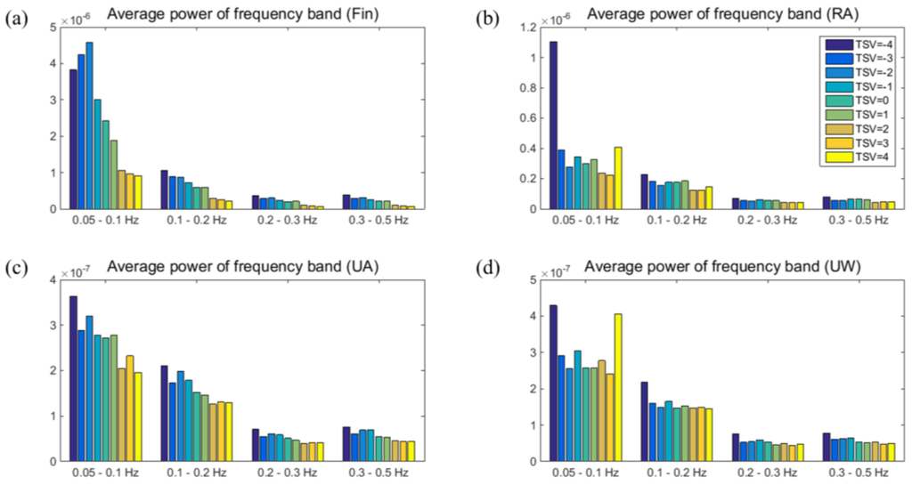 Although the mSKT or some gSKTs had a correlation higher than 0.60 in terms of thermal sensation, the range of mSKT was still broad in one scale of thermal sensation. Therefore, we included spectral parameters in the thermal sensation estimation model. As shown in Figure 5, the average power of each frequency band was generally decreased as the TSV increased. Specifically, there was a significant difference in the BP measured from the fingertip or RA when TSV = 1 (slightly warm) and TSV = 2 (warm) (α = 0.05). In addition, BP obtained from the UW was significantly different when TSV = −4 (very cold) and TSV = −3 (cold).