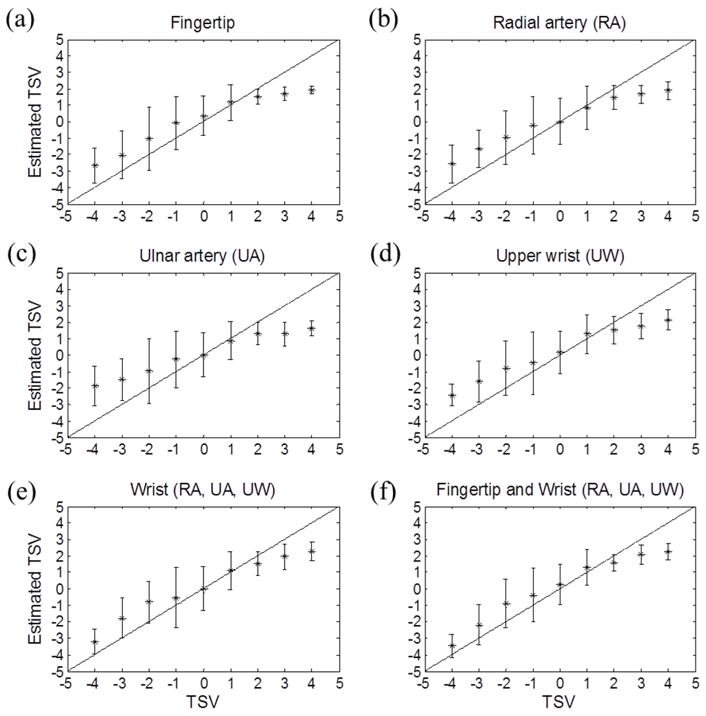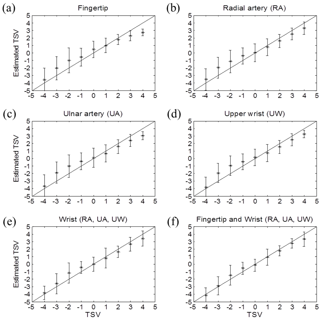 Measured versus the estimated overall thermal sensation in various measurement positions—(a) fingertip; (b) radial artery (RA) region; (c) ulnar artery (UA) region; (d) upper wrist (UW); (e) 3 wrist regions (RA, UA, UW); (f) fingertip and 3 wrist regions (RA, UA, UW). TSV means thermal sensation vote.