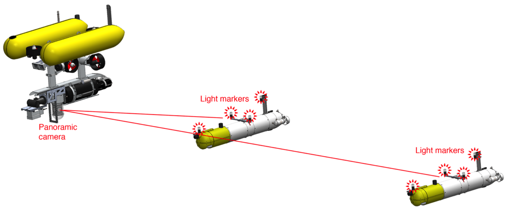 Precise navigation data for all vehicles are fundamental for a good reconstruction of the multi-vehicle optical mosaic []. The formation control was performed with acoustic ranging following the MORPH guidelines [,]. The light beacons were used as an experimental technology being field tested at the time. As such, the tracking was not used in the formation control loop, but served as an important tool for online mission monitoring and to assist the data post-processing.
