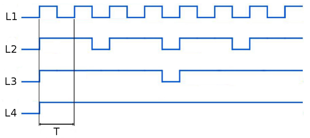 Blinking pattern of each marker of the light beacon set. Each beacon has a distinctive pattern allowing the global identification in the minimum time possible while there are at least three beacons lit more than 50% of the time.