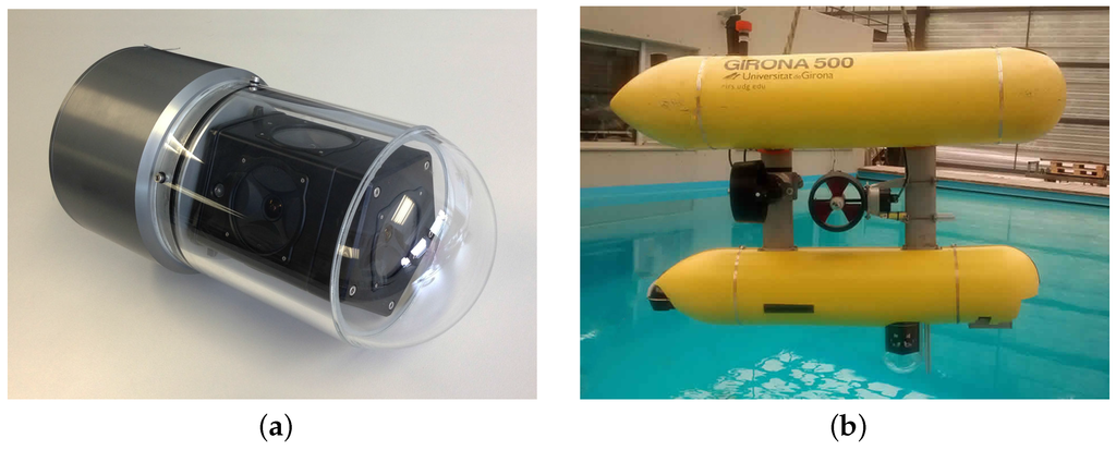 Omnidirectional camera and assembly in Girona500 AUV. The camera was installed under the bottom cylinder to have a clear view of the bottom hemisphere and is protected by two aluminum bars installed in front of the camera. (a) Omnidirectional underwater camera based on a Point Grey’s Ladybug camera and a custom waterproof housing; (b) the Girona500 AUV equipped with the omnidirectional camera.