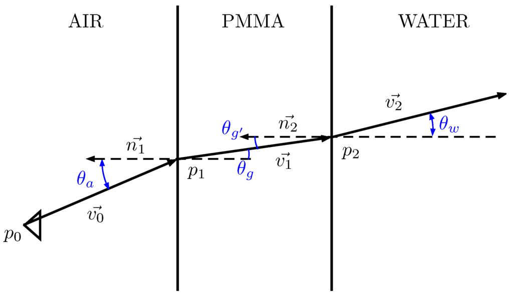 The underwater calibration consisted of determining the exact position and orientation of the waterproof housing with respect to the camera. It is worth noticing that the direction of the rays changes at every medium transition found along the path from the imaging sensor inside the camera to a point underwater (Figure 5). A small error in the relative position of the housing can lead to a big inaccuracy in the direction of the final ray.