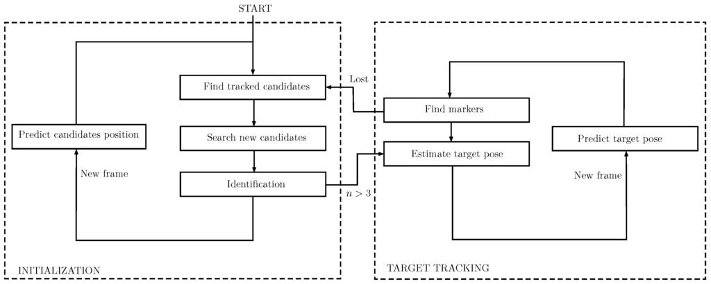 The tracking of the target vehicle is divided into two stages (Figure 6). The first stage consists of an initialization step, where the pose of the vehicle is unknown and there is not enough information available for its estimation. The second stage begins when there is enough information for estimating the pose of the target vehicle, and it lasts until the tracking of the vehicle is lost, where the system returns to the initial stage.