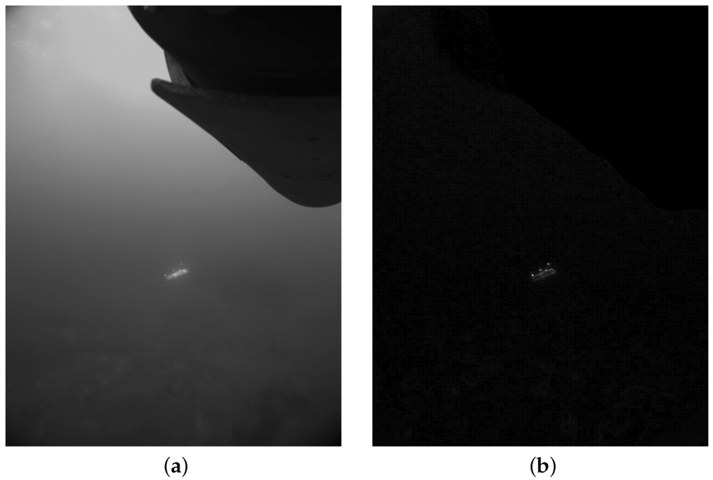 Sample image and its corresponding gradient image. (a) Original grayscale image; (b) gradient image with a mask for the part corresponding to the body of the AUV carrying the camera.