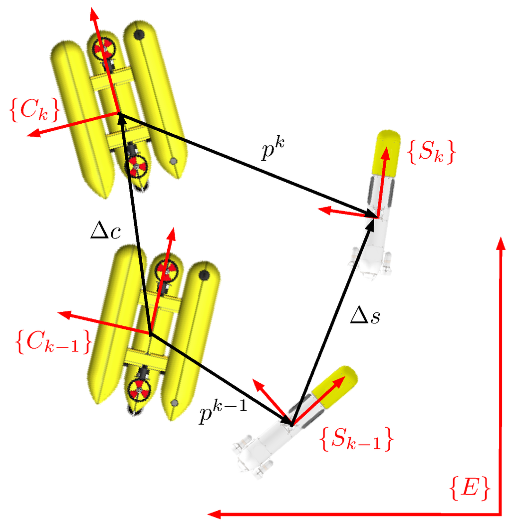 Once the 3D point corresponding to the last frame, , has been computed, it can be rotated and translated according to the transformation matrix, , which transforms a point from the  coordinate system to the k coordinate system and is computed according to the navigation system of the camera vehicle: