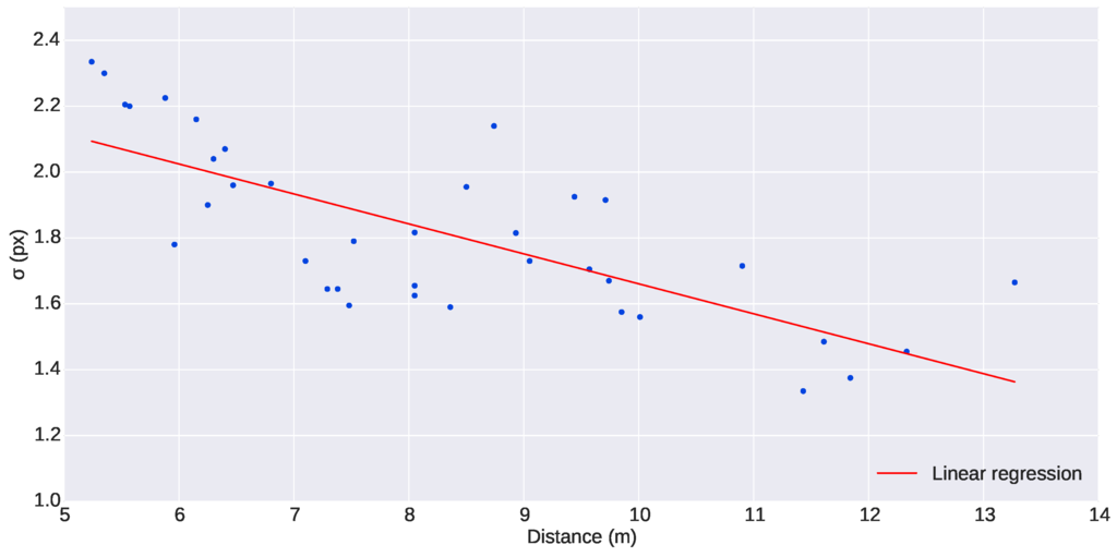 The uncertainty in the localization of the lights in the image is inversely dependent on the distance of the beacon from the camera. The closer the beacon is to the camera, the larger the projected light disk will be in the image, thus leading to higher location uncertainty than far away beacons that appear in the image as small disks. In order to have an approximate value of this uncertainty, the size of the lights was analyzed from a set of selected images of the experiment presented in this paper. The beacons in the images were fitted to a 2D Gaussian distribution centered at u, with standard deviation σ, amplitude A and an offset : . The standard deviation of the 2D Gaussian distributions, σ, found can be used as an indicative value of the uncertainty of the location procedure. The experimental evidence from the mission presented in this paper (Figure 9) showed that the variation of σ is small enough to be considered constant within the range of distances of the experiments (5 to 12 m). A conservative mean value of  pixels was chosen for the standard deviation of both horizontal and vertical pixel uncertainties. The covariance used was: