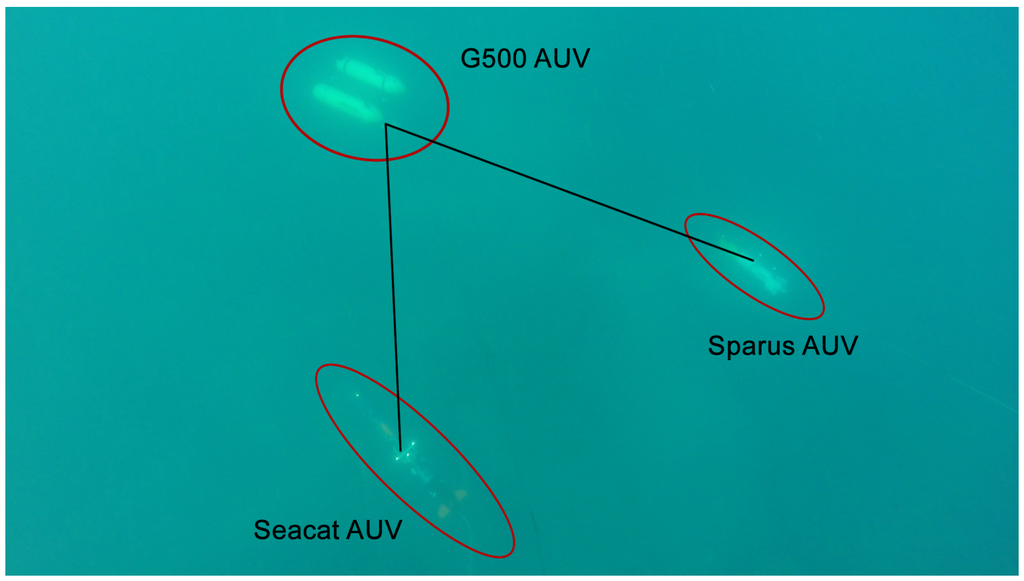 A solution to the underwater relative position measurement for multiple AUVs, was developed within the framework of the European GREX (Coordination and control of cooperating unmanned systems in uncertain environments) project (2006–2009) [,]. The navigation systems of each vehicle were combined with acoustic ranging from modems, to keep formation while following a predefined path. This achievement paved the way for underwater applications featuring multiple AUVs. Formation flying was limited to areas with approximately flat seafloors due to constraints on the vehicles pre-planned formation and to ensure reliable use of DVLs. Over rough terrain, DVLs tend to be highly inaccurate, and are of limited use for ensuring vehicle safety in tight formations. In the TRIDENT (Marine Robots and Dexterous Manipulation for Enabling Autonomous Underwater Multipurpose Intervention Missions) project (2010–2013) [], a homing and docking solution using a USBL was tested. An intervention AUV (I-AUV) [] was placed in charge of a survey and intervention mission, while an autonomous surface craft (ASC) was employed at the surface for communications purposes. Once the intervention mission was finished, the I-AUV (fitted with the USBL transceiver array) started a homing and docking procedure in order to dock in a special structure in the ASC, where the USBL beacon was located.