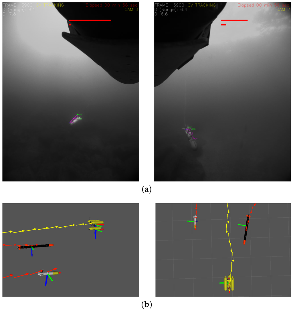 Snapshots of the system while tracking simultaneously two target vehicles. (a) Processed images from two independent cameras while the system is tracking two different target vehicles: Sparus (left) and Seacat (right); (b) left: lateral view of the reconstructed scene in the Rviz simulator; right: top view of the reconstructed scene in the Rviz simulator.