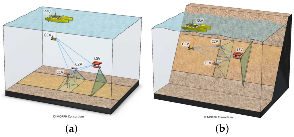 The use of a team of robots navigating in a close formation has the potential to significantly expand the coverage swath in mapping missions that require close proximity to the seafloor, such as optical or electromagnetic surveying. In areas of high topography, rigid arrays of sensors cannot be used safely, whereas AUV formations can provide the required degree of terrain compliance. The present work has been developed within the framework of the MORPH ( Marine robotic system of self-organizing, logically linked physical nodes) EU-FP7 project (2012–2015) described in []. This project proposes a novel concept of an underwater robotic system that emerges out of using different mobile robot modules with distinct and complementary resources. These mobile robots navigate at a very close range as a group and have the ability to adapt the formation to changes in the terrain. The most relevant concept with respect to this paper is that an underwater vehicle equipped with a multibeam sonar profiler advances at the forefront of the formation, flying at a “safe” altitude from the sea-floor, while two other vehicles fly behind, very close to the bottom, acquiring images. As can be deduced, precise knowledge of the poses of all robots during the missions is fundamental for both safe navigation and an accurate reconstruction of the optical and acoustic maps. The relative localization between vehicles is done through acoustic ranging. There has been space, though, for experimenting with the use of a vision-based method as an alternative for relative localization at short distances, where acoustics cannot provide updates with enough precision and frequency to ensure safety.