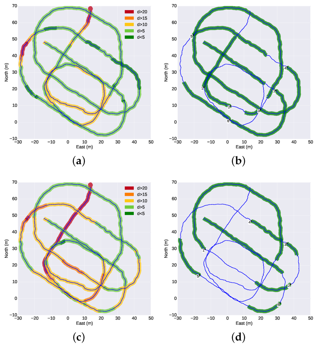 Top view of the trajectory of the G500 during the mission. The distances between G500 and target vehicles are color-coded (a,c); and the intervals of sustained tracking operation are marked in green (b,d). The points where the tracking was lost are numbered (b,d) for further analysis in Table 1 and Table 2. The survey of the vertical wall corresponds to the lower-left corner of the images. (a) Distance between G500 and Seacat; (b) intervals of optical tracking of the Seacat; (c) distance between G500 and Sparus; (d) intervals of the optical tracking of the Sparus.