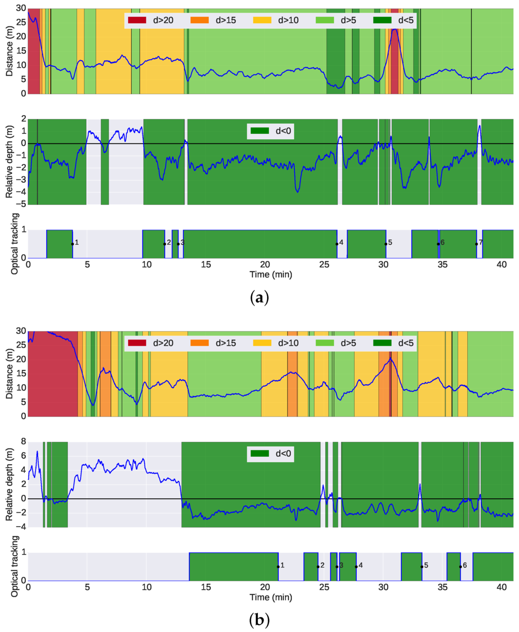 Analysis of intervals with optical tracking versus distance and relative depth between G500 and the target vehicles. Looking at the three plots in conjunction, it is easy to infer the necessary conditions for the operation of the optical tracking. (a) Top: analysis of the distance between G500 and Seacat over time; middle: analysis of the relative depth between G500 and Seacat over time. Negative values mean that Seacat was below G500; thus, the optical tracking was plausible. Bottom: intervals of optical tracking. The points where the tracking was lost are numbered for further analysis in Table 1; (b) Top: analysis of the distance between G500 and Sparus over time; middle: analysis of the relative depth between G500 and Sparus over time. Negative values mean that Sparus was below G500; thus, the optical tracking was plausible. Bottom: intervals of optical tracking. The points where the tracking was lost are numbered for further analysis in Table 2.