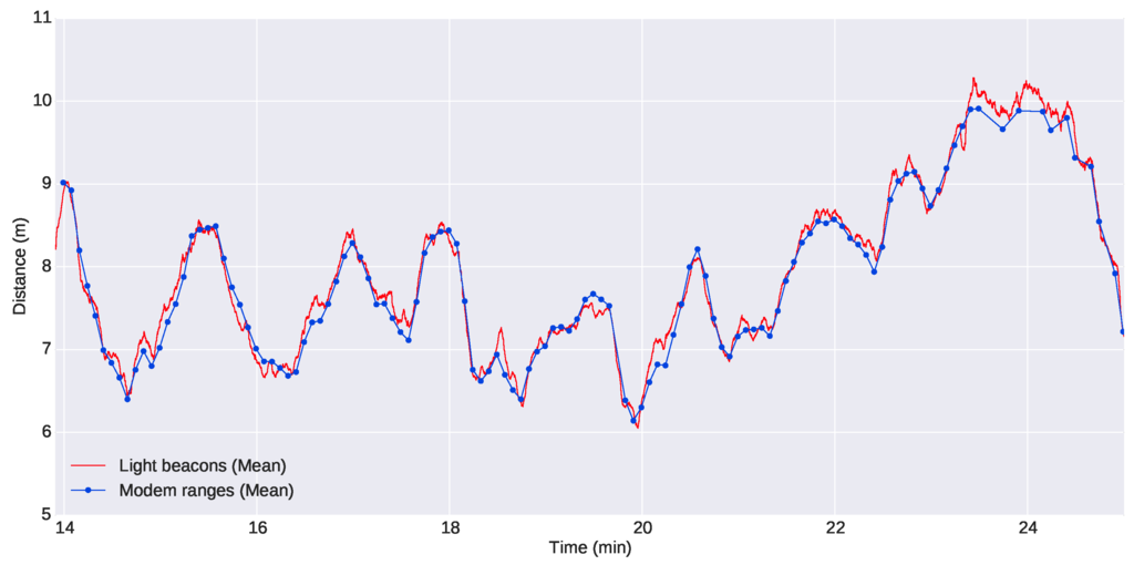 Figure 16 shows a comparison of the distance between the G500 and the Seacat AUV computed through acoustic ranges and using the light beacon system: the two online localization systems that were available for the leading vehicle. Looking at the figure, it is clear that there is a high level of agreement between the two systems, and there is no apparent offset between the different approaches. We can also see the difference in the number of updates.
