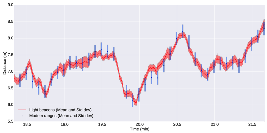 Comparison of the distance between the G500 and the Seacat estimated using light beacons and acoustic ranges.