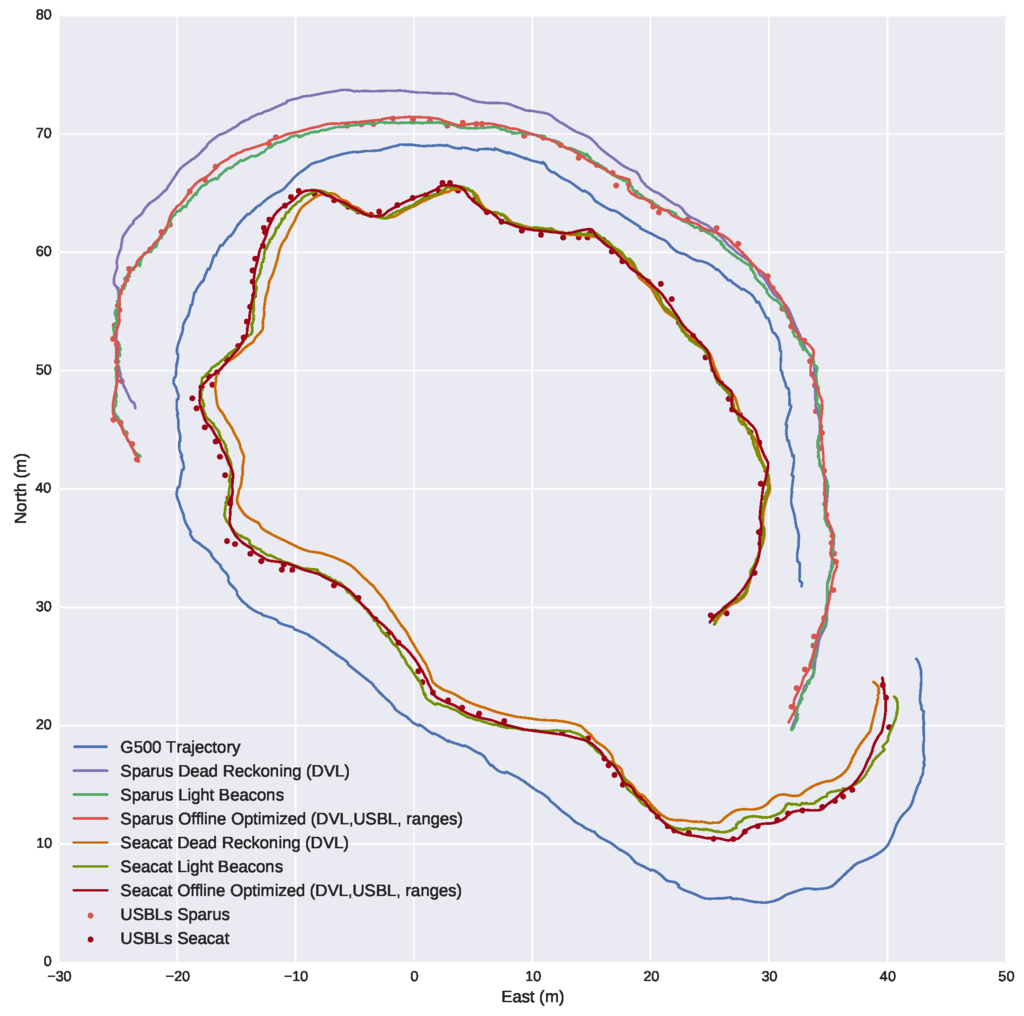 - Comparing the trajectories computed by the internal navigation systems of each vehicle, labeled as dead reckoning, with the USBL updates and the trajectories computed by the other systems, we can infer that the internal navigation systems have a significant drift over time, especially Sparus, due to the fact that they are based on inertial sensors and DVL.