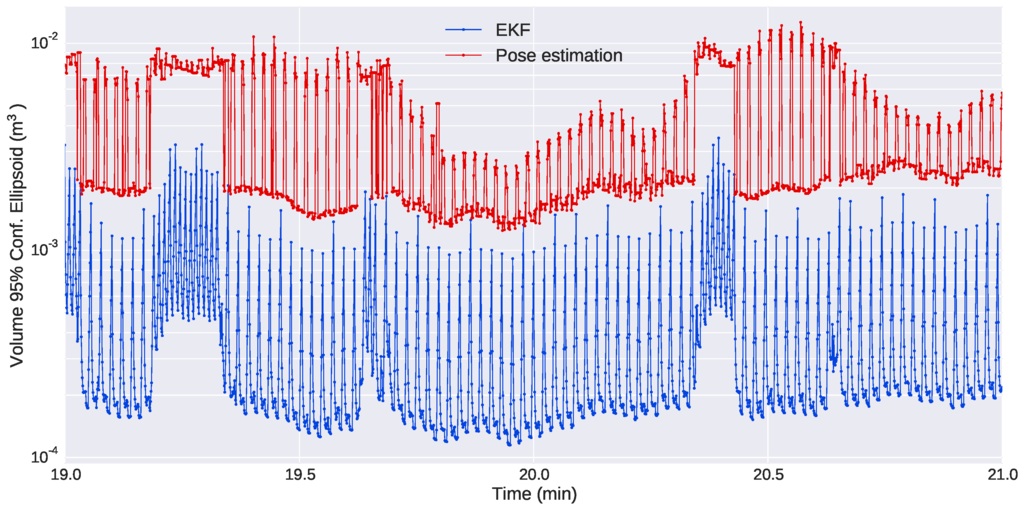 Finally, Figure 19 show the evolution of the uncertainties in the position of the Seacat during a section of the mission. The plot shows the difference in the uncertainties of the estimates computed from three or four markers and how the uncertainty grows when the pose of the target vehicle only allows the sight of three of them. It is also evident how the use of the EKF allows a drastic reduction in the uncertainty of the estimates and, thus, improves significantly the performance of the optical system.