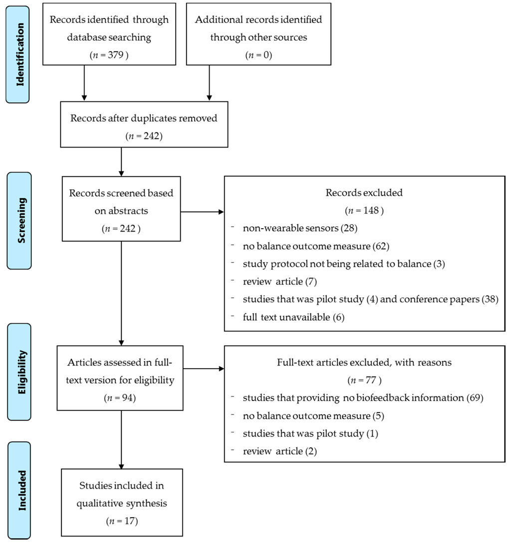 Figure 1 shows the searching result and process of screening the publications. A total of 379 publications were identified after the 3-step literature search. After removing any duplicated publications, 242 publications remained. An initial screening of the abstracts removed a further 148 publications for not conforming to the inclusion criteria, which involved (1) non-wearable sensors (28 publications); (2) no balance outcome measures (62 publications); (3) study protocols not being related to balance (three publications); (4) review articles (seven publications); (5) studies that were pilot studies (four publications) and conference papers (38 publications), and (6) unavailable full text (six publications). The remaining 94 publications were further reviewed in their full-text versions to confirm they strictly met the inclusion criteria. A total of 77 publications were then excluded, as they: (1) did not provide sufficient biofeedback information (69 publications); (2) did not have any balance outcome measures (five publications); (3) were pilot studies (one publication); and (4) were review articles (two publications). Finally, seventeen publications met the inclusion criteria and were included in this review (Figure 1).