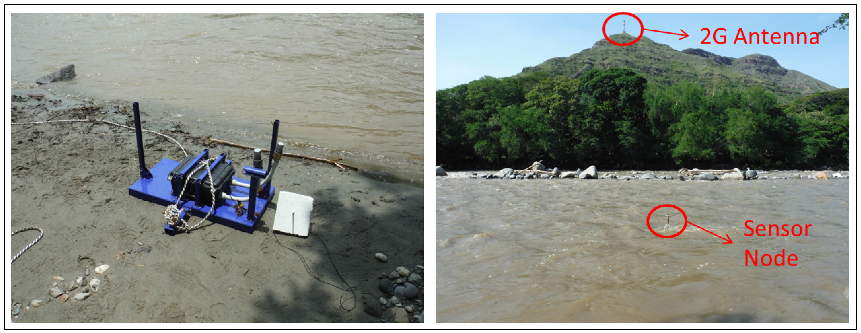 Simulation scenarios. X = 1. Wireless Sensor Network (WSN) nodes in the river. X = 2. WSN nodes all around the map.