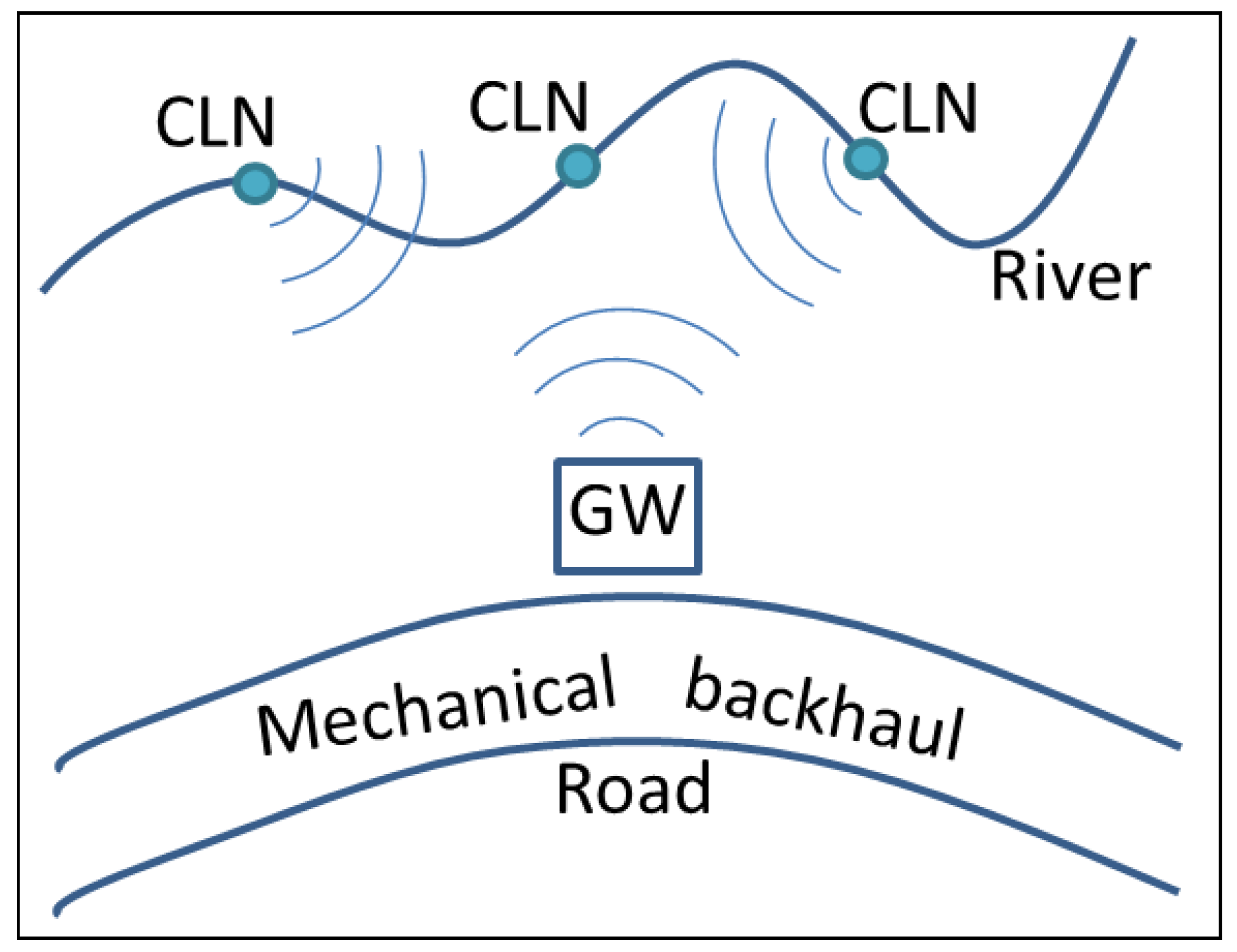GOLDFISH project description. Sensor Nodes (CLN), Management and Monitoring Station (MMS), and Gateways (GW) are depicted.