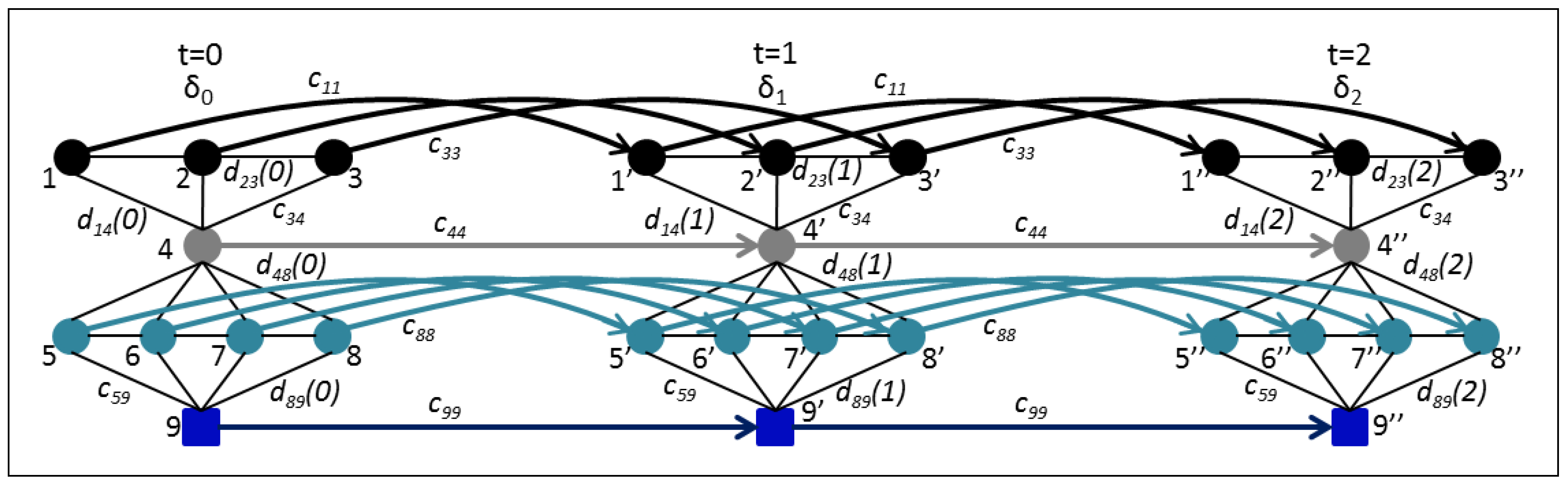 Problem graph through time. Temporal links go from left to right and represent nodes’ buffers.