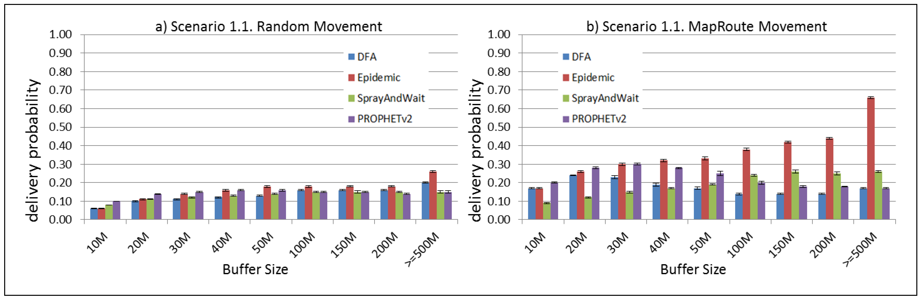 Results for scenario 1.4. Delivery probabilities with different Buffer Sizes, generating 2 MB messages every 1 to 2 h, (a) MAPs moving randomly on the path; (b) MAPs following the path in only one direction. DFA: Distributed Forwarding Algorithm.