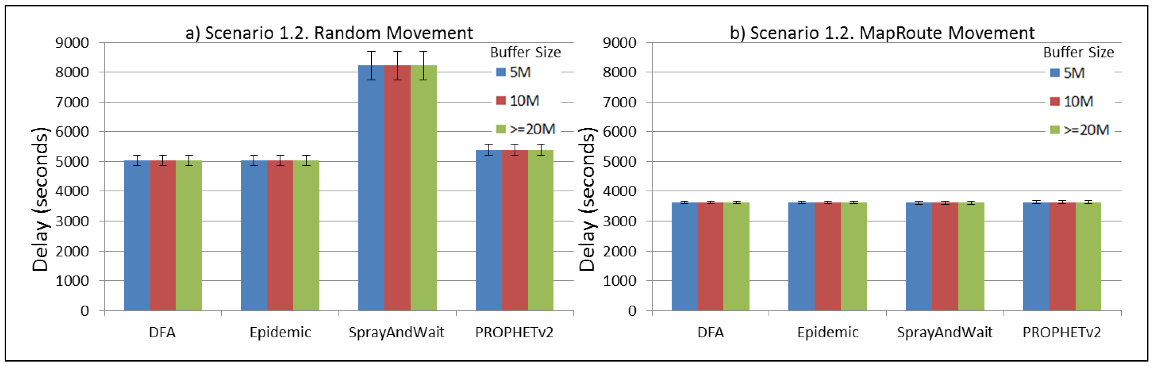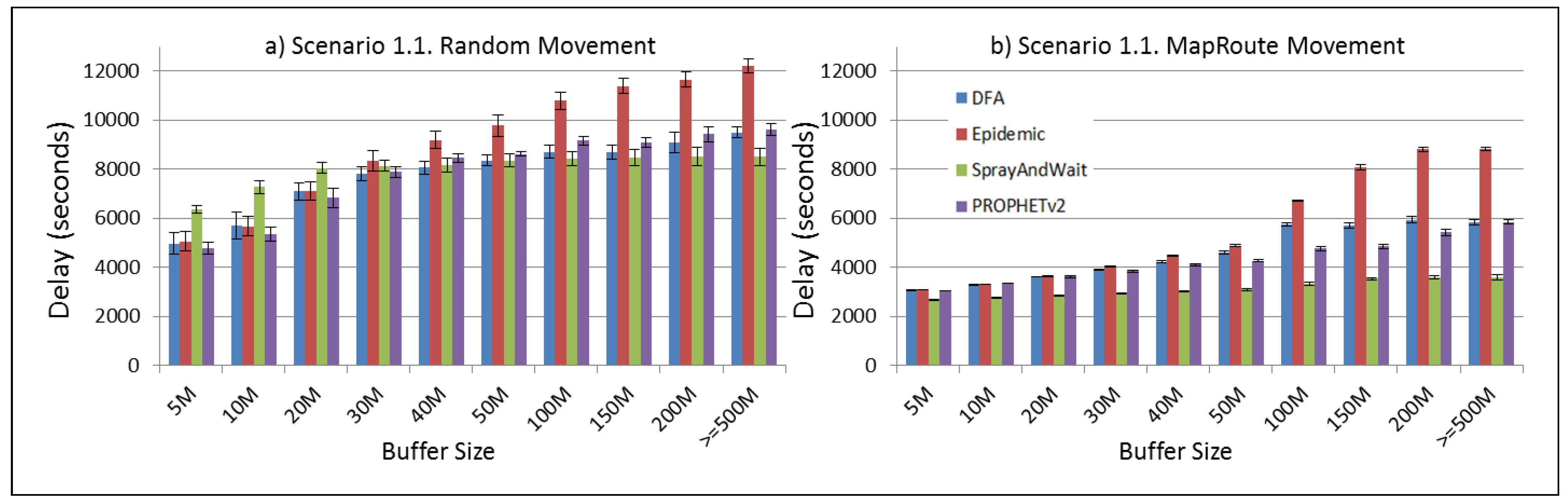 Results for scenario 1.3. Average delay in seconds with different Buffer Sizes, generating 2 kB messages every 1 to 2 h, (a) MAPs moving randomly on the path; (b) MAPs following the path in only one direction. DFA: Distributed Forwarding Algorithm.