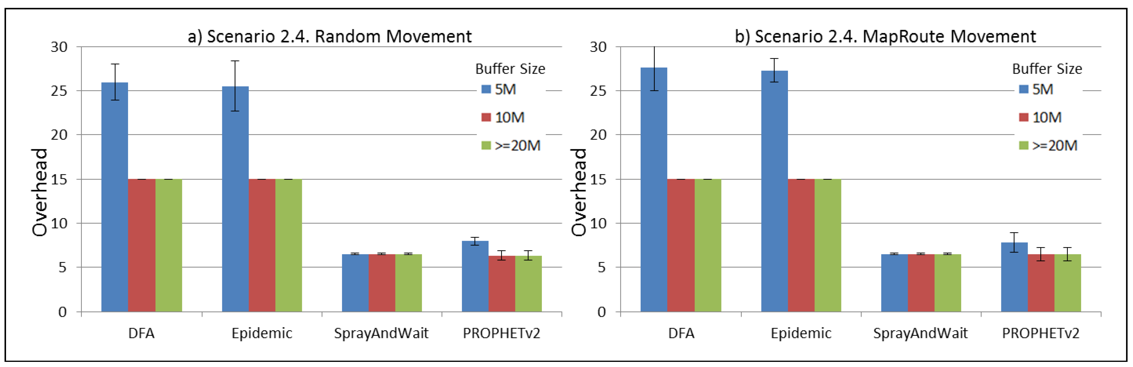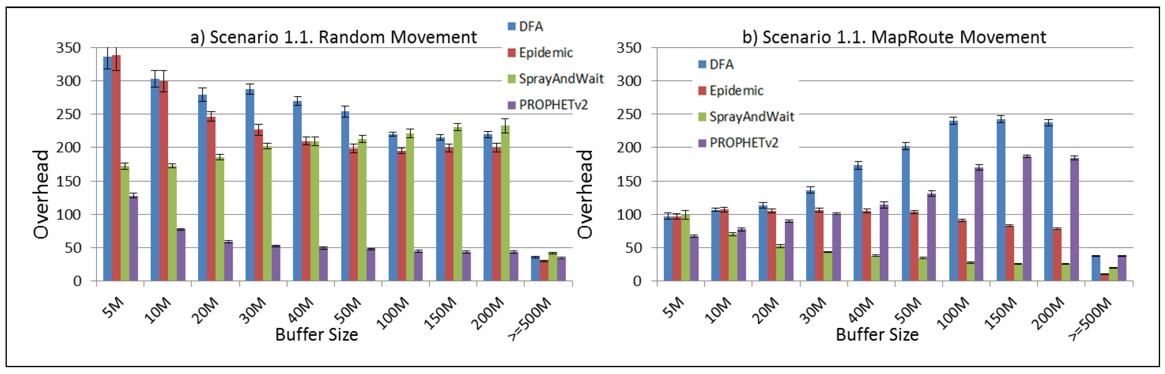 Results for scenario 2.4. Average overhead with different Buffer Sizes, generating 2 MB messages every 1 to 2 h, (a) MAPs moving randomly on the path; (b) MAPs following the path in only one direction. DFA: Distributed Forwarding Algorithm.