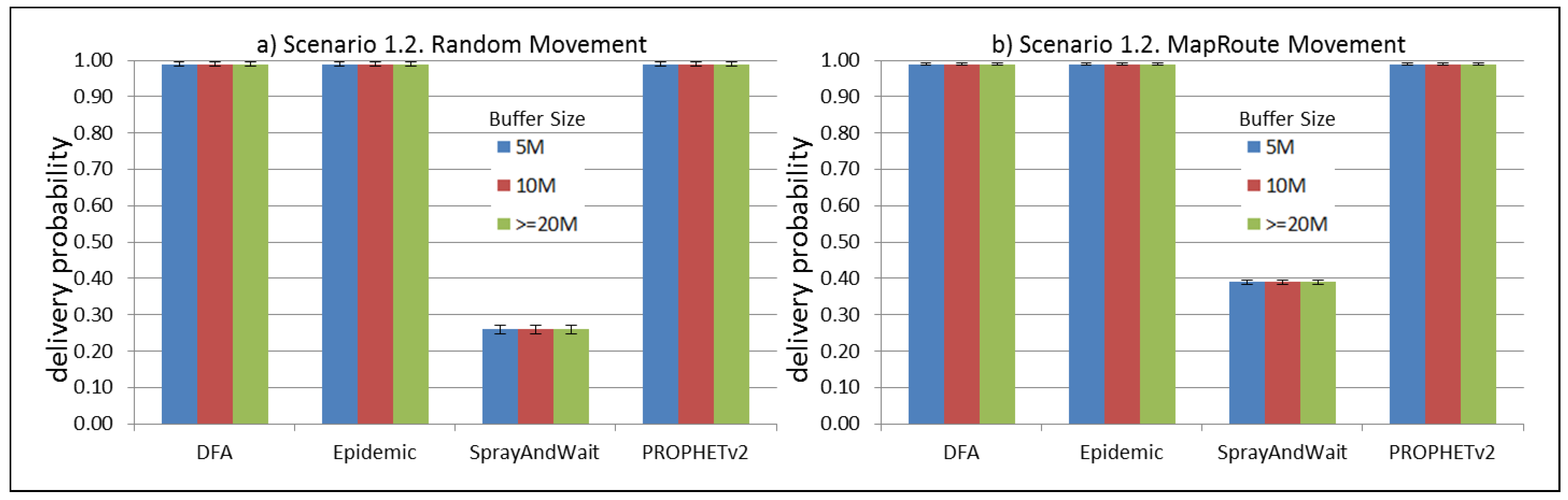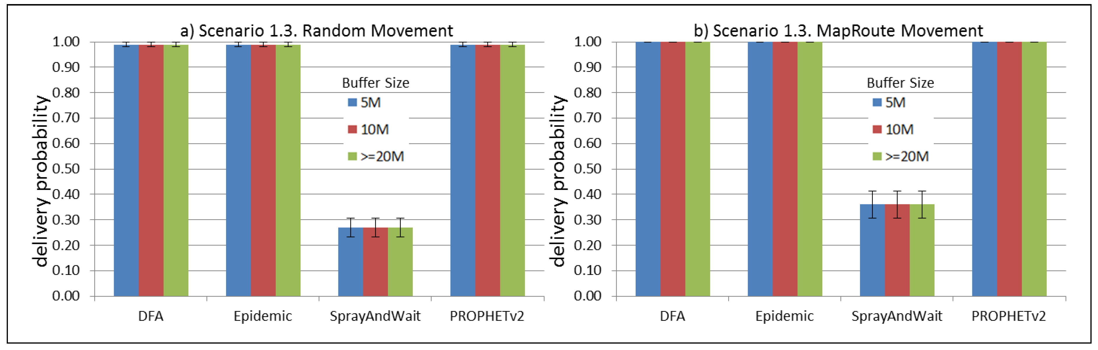 Results for scenario 1.3. Delivery probabilities with different Buffer Sizes, generating 2 kB messages every 1 to 2 h, (a) MAPs moving randomly on the path; (b) MAPs following the path in only one direction. DFA: Distributed Forwarding Algorithm.