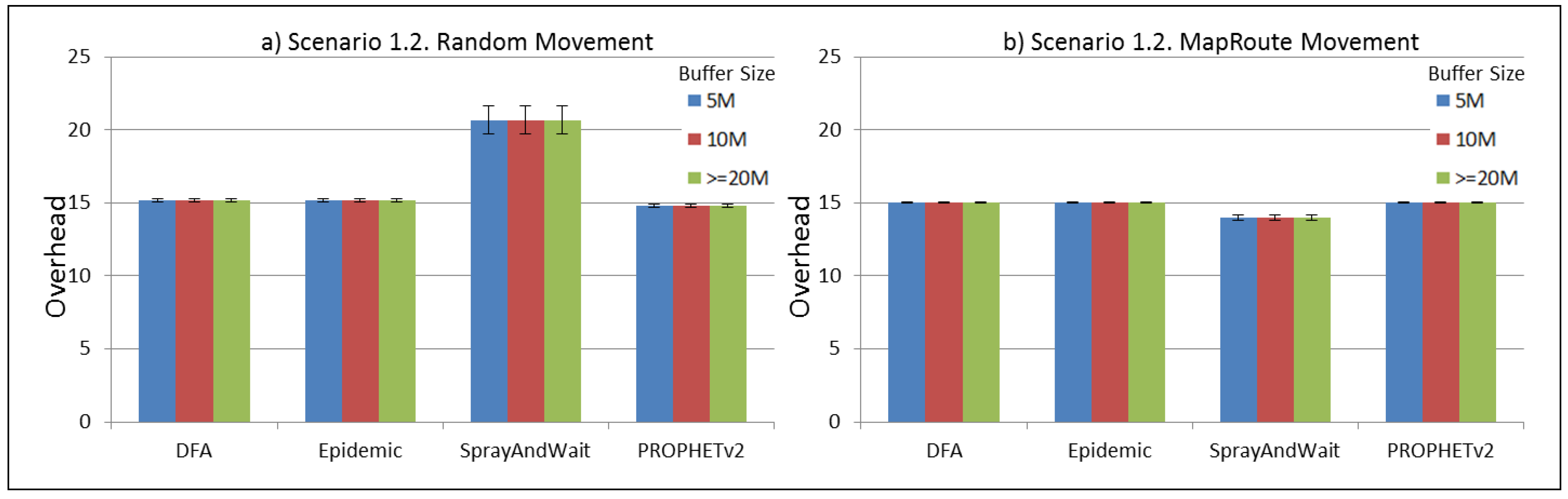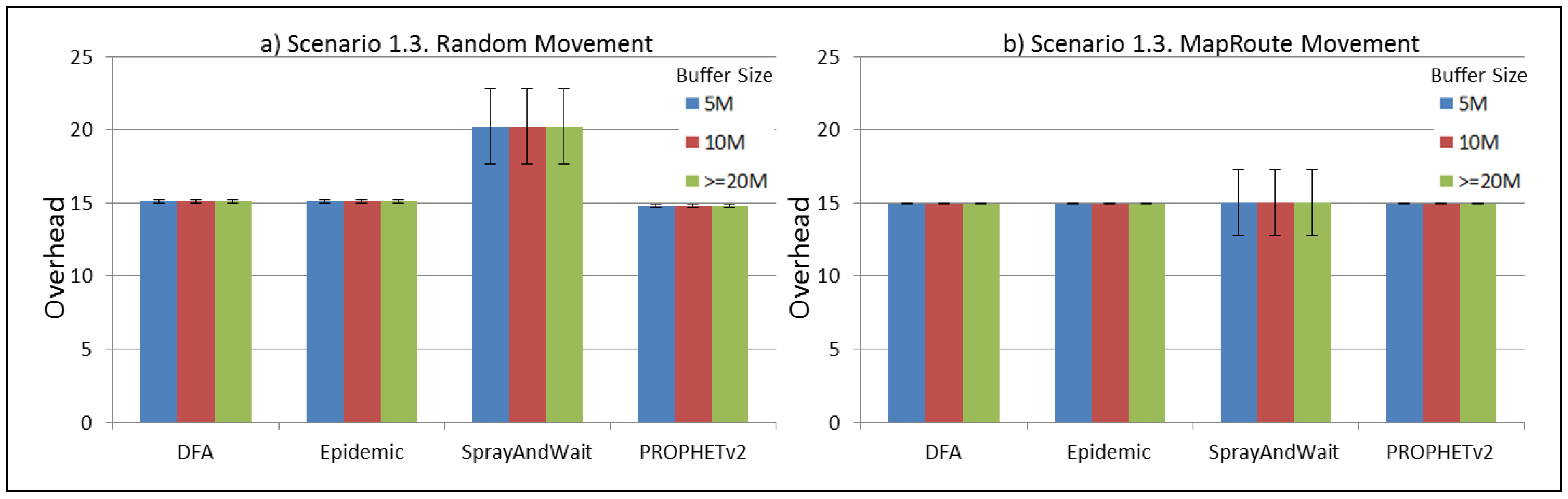 Results for scenario 1.3. Average overhead with different Buffer Sizes, generating 2 kB messages every 1 to 2 h, (a) MAPs moving randomly on the path; (b) MAPs following the path in only one direction. DFA: Distributed Forwarding Algorithm.