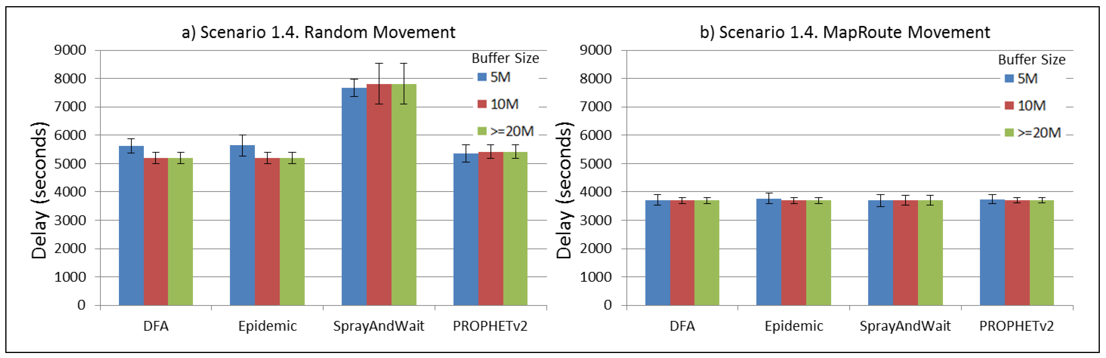 Results for scenario 1.4. Average delay in seconds with different Buffer Sizes, generating 2 MB messages every 1 to 2 h, (a) MAPs moving randomly on the path; (b) MAPs following the path in only one direction. DFA: Distributed Forwarding Algorithm.