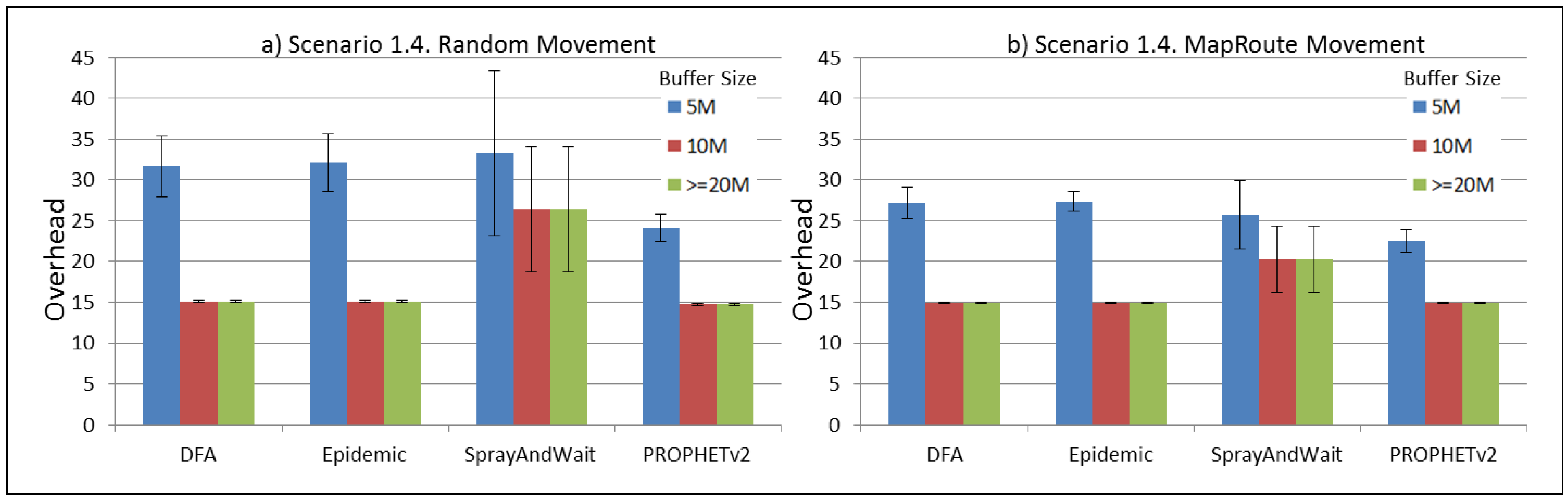 Results for scenario 1.4. Average overhead with different Buffer Sizes, generating 2 MB messages every 1 to 2 h, (a) MAPs moving randomly on the path; (b) MAPs following the path in only one direction. DFA: Distributed Forwarding Algorithm.