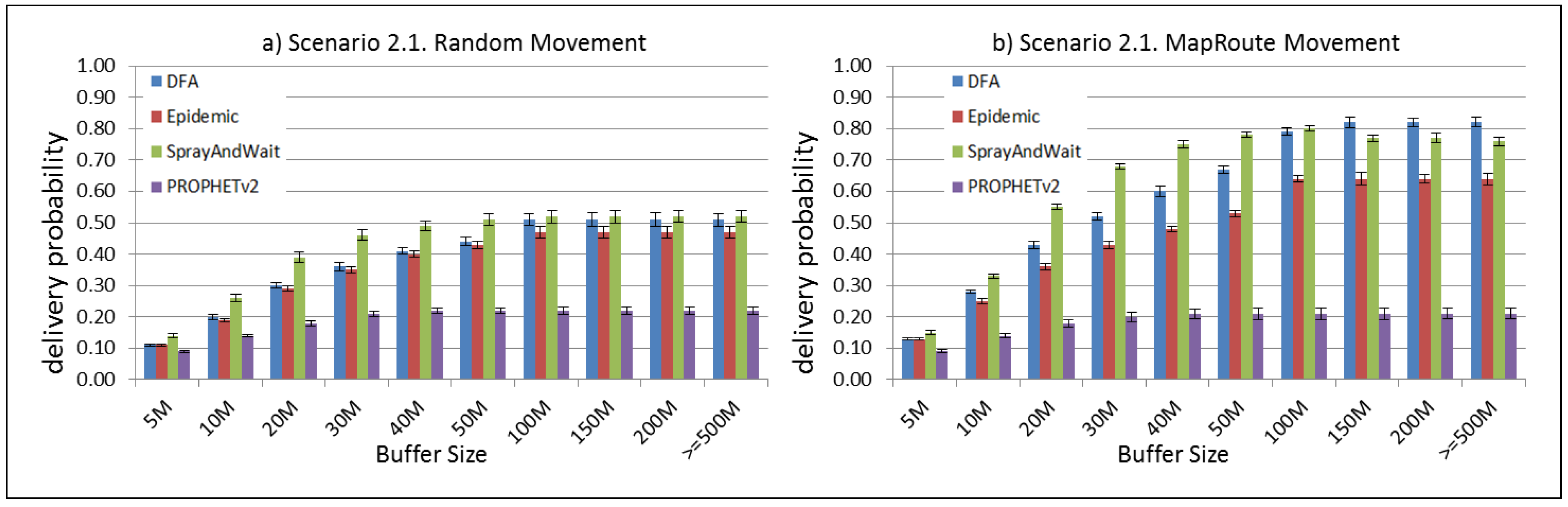 Results for scenario 2.1. Delivery probabilities with different Buffer Sizes, generating 2 MB messages every 1 to 2 min, (a) MAPs moving randomly on the path; (b) MAPs following the path in only one direction. DFA: Distributed Forwarding Algorithm.