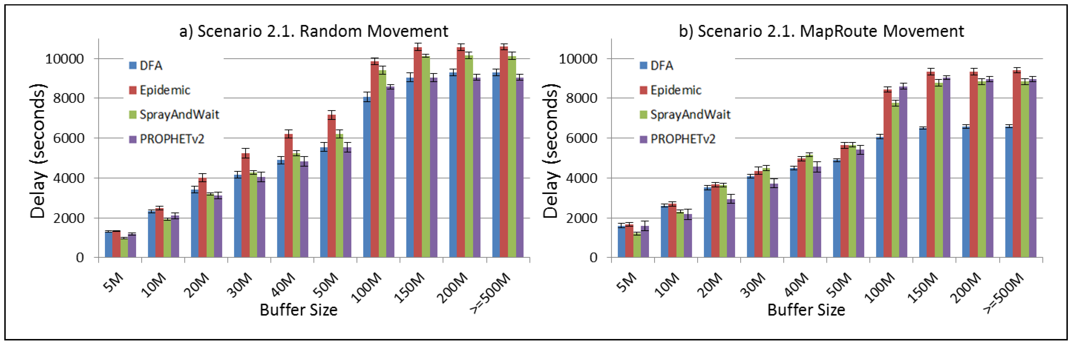 Results for scenario 2.1. Average delay in seconds with different Buffer Sizes, generating 2 MB messages every 1 to 2 min, (a) MAPs moving randomly on the path; (b) MAPs following the path in only one direction. DFA: Distributed Forwarding Algorithm.