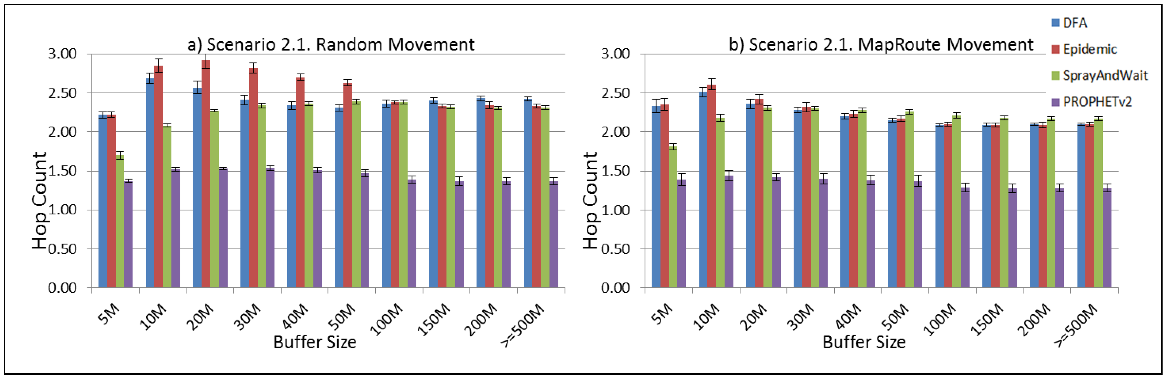 Results for scenario 2.1. Average hop count with different Buffer Sizes, generating 2 MB messages every 1 to 2 min, (a) MAPs moving randomly on the path; (b) MAPs following the path in only one direction. DFA: Distributed Forwarding Algorithm.