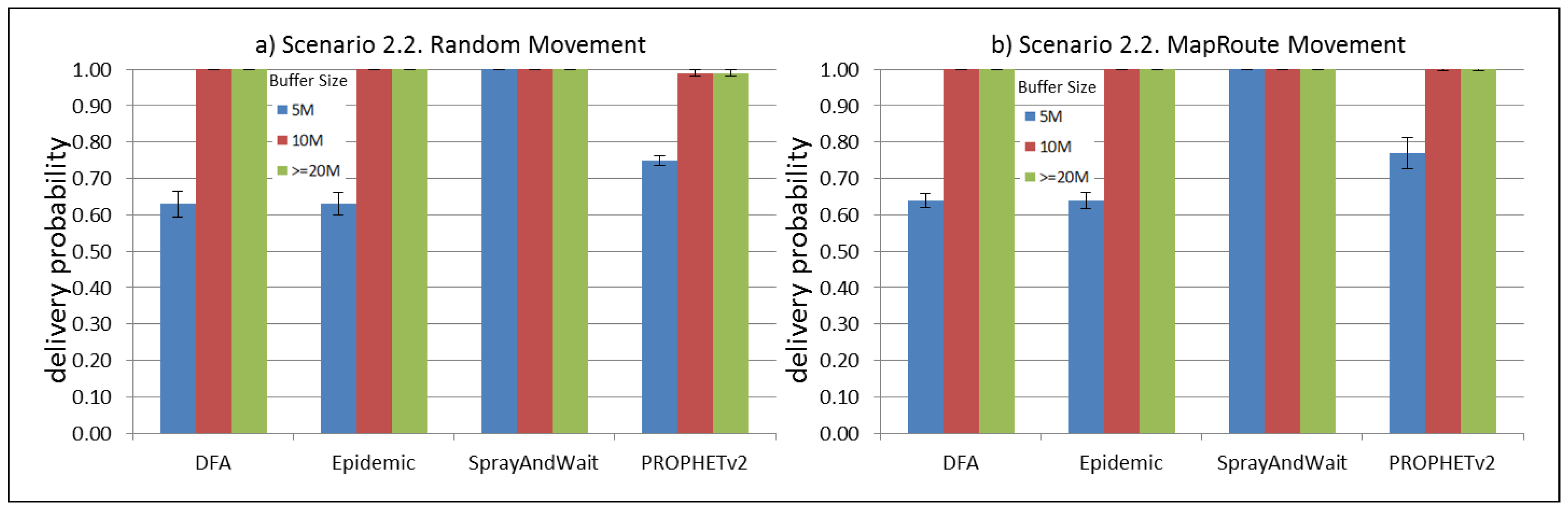 Results for scenario 2.4. Delivery probabilities with different Buffer Sizes, generating 2 MB messages every 1 to 2 h, (a) MAPs moving randomly on the path; (b) MAPs following the path in only one direction. DFA: Distributed Forwarding Algorithm.