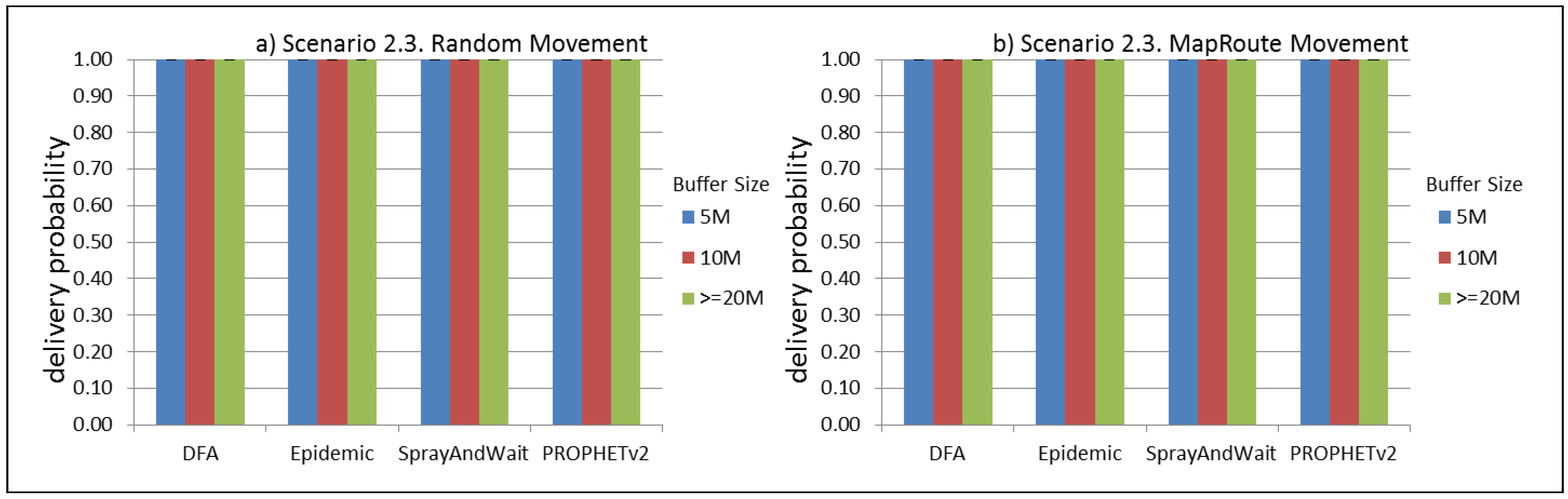 Results for scenario 2.3. Delivery probabilities with different Buffer Sizes, generating 2 kB messages every 1 to 2 h, (a) MAPs moving randomly on the path; (b) MAPs following the path in only one direction. DFA: Distributed Forwarding Algorithm.
